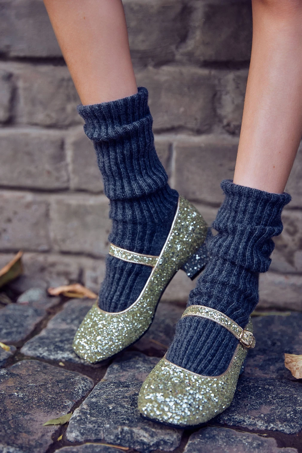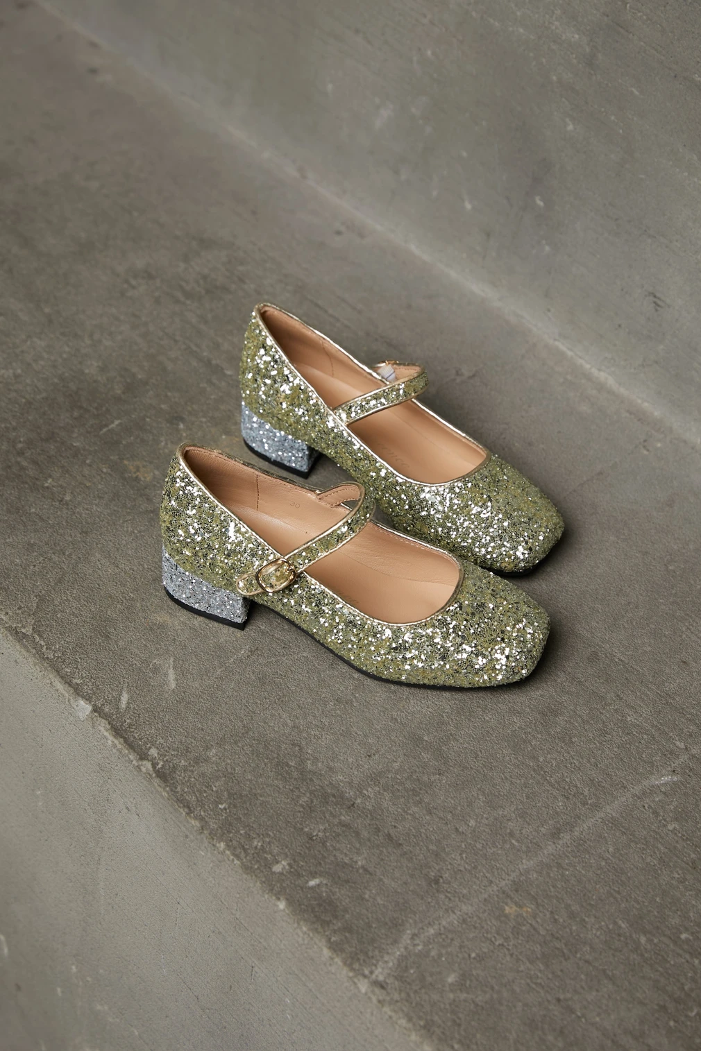 В этих туфельках есть абсолютно все, чтобы мы с полной уверенностью смогли отнести их к стилю "гламурный шик". Кожаные внутри и покрытые золотым и серебряным глиттером снаружи, на каблучке, с квадратным носиком и ремешком, как Mary Jane, они кажутся почти игрушечными. Даже не знаем, хватит ли у вас силы воли запирать их в шкафу в будние дни.