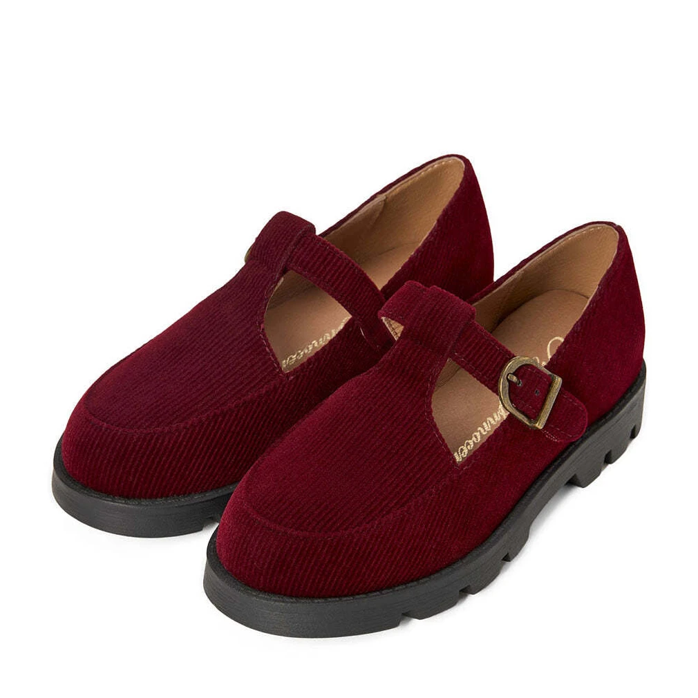 Туфли на толстой подошве с протектором с Т-образной застежкой-ремешком велькро — абсолютный хит наших школьных коллекций на протяжении уже нескольких сезонов. В этот раз мы решили внести разнообразие в уже знакомый силуэт при помощи вельвета синего, бордового, коричневого или зеленого цвета. При этом внутренняя часть туфель осталась кожаной. Одежду к такой обуви можно подобрать практически любую: абсолютно органично будет смотреться как юбка с крупной плиссировкой, так и прямые широкие брюки.