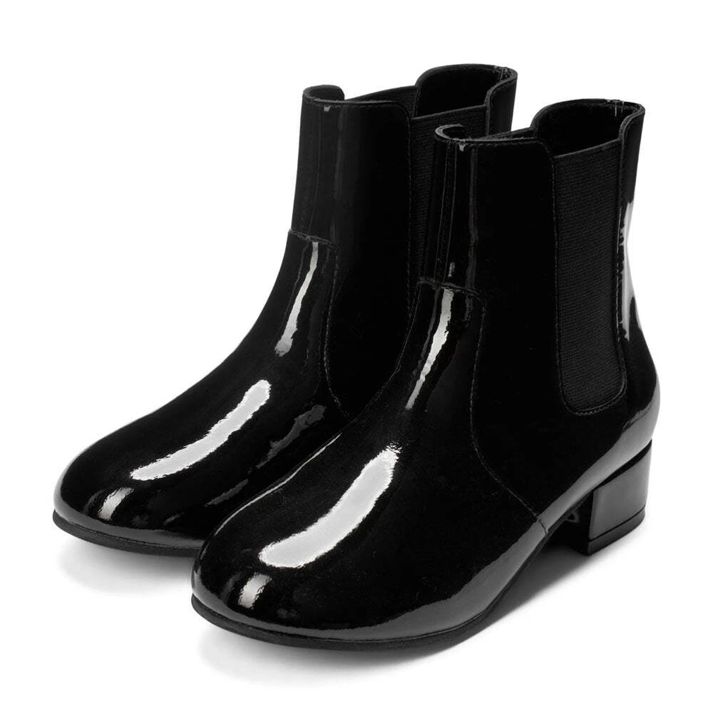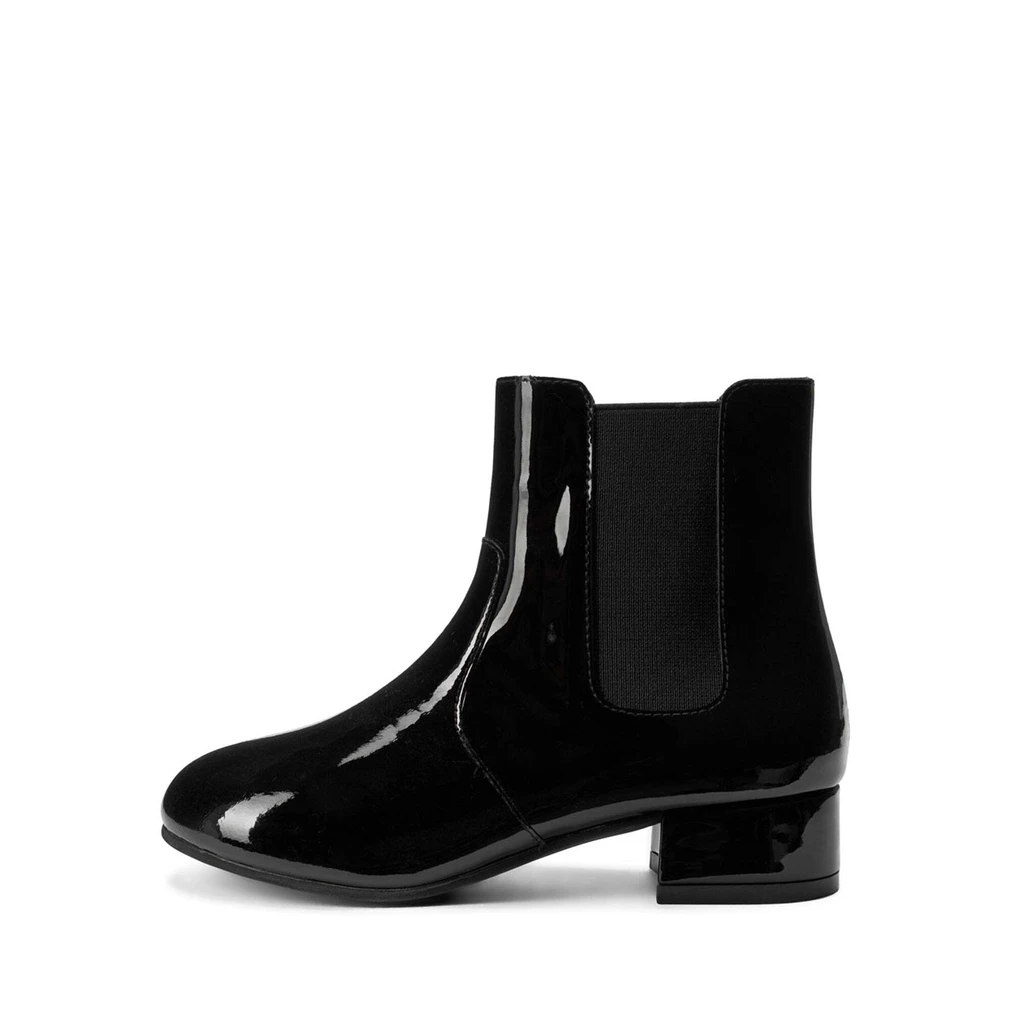 Эти челси на каблуке можно и нужно носить с миди-юбками, строгими брюками и даже платьями из тонкой шерсти или трикотажа. В общем перед вами та самая модель, которая прекрасно завершит весь ансамбль или станет его акцентной составляющей, благодаря лакированной коже, каблуку и боковым вставкам из эластичной ткани.