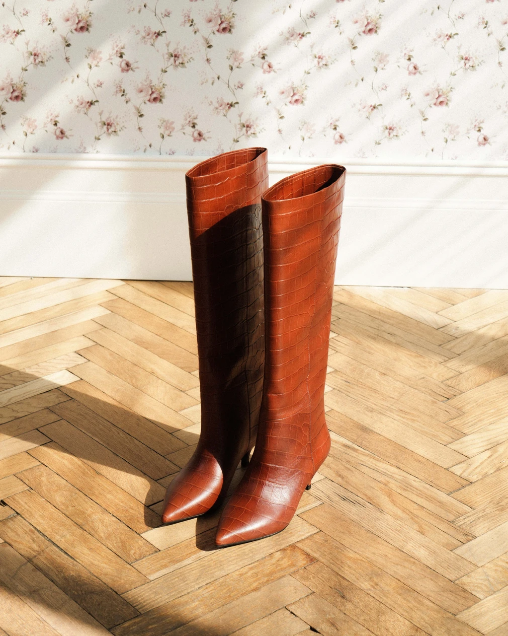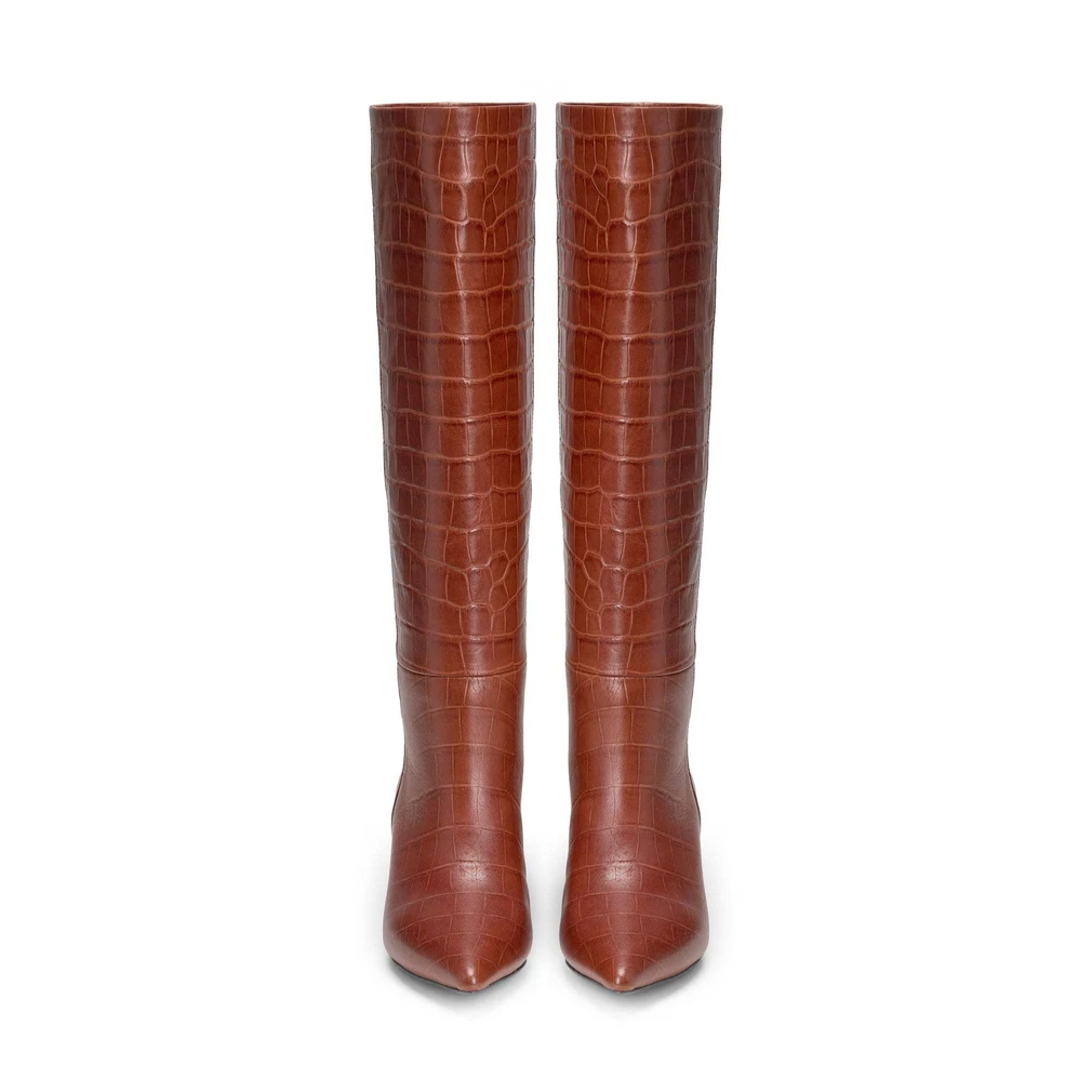 Высокие кожаные сапоги Brigitte карамельного цвета с тиснением под крокодила — знаковая модель нашей осенне-зимней коллекции. Чуть суженный нос, небольшой каблук-рюмочка, высота под колено — это та самая переосмысленная классика, которая оказывается наиболее востребованной при составлении самых разных образов. Мы советуем носить их с длинными юбками и кашемировыми платьями, а также с узкими брюками и джинсами, заправив внутрь.