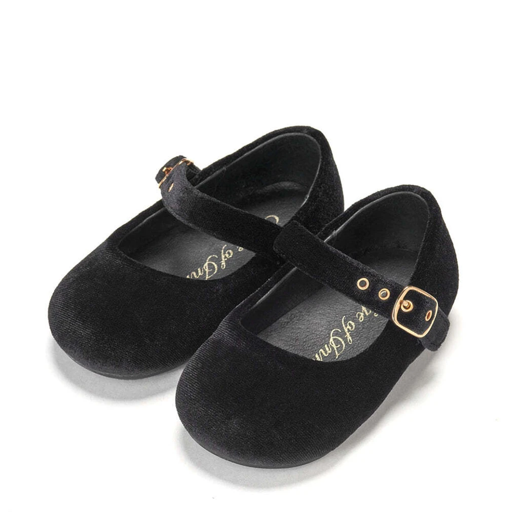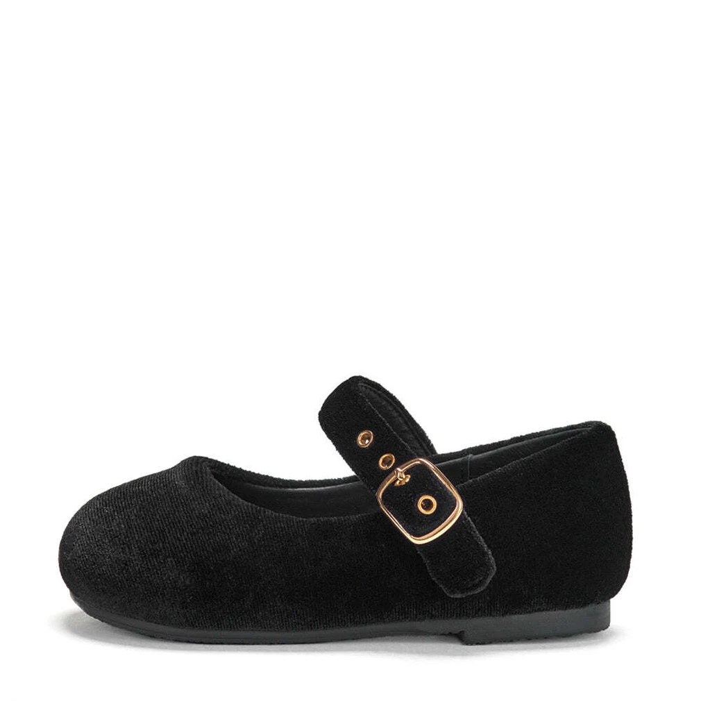 Бархатные туфельки Eva черного цвета идеальны для праздника или вечернего выхода. Декорированные лишь минималистичной золотой пряжкой они будут хорошо смотреться как с нарядным платьем, так и со школьной формой или укороченными джинcами.