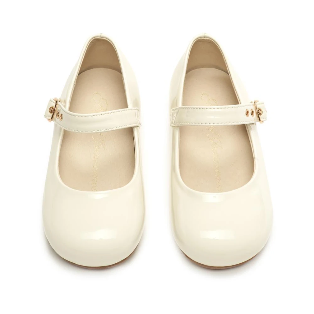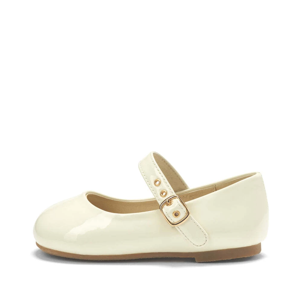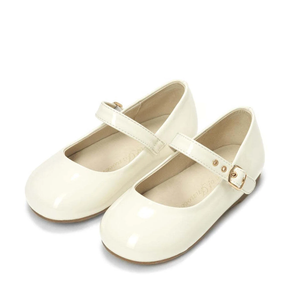 Лакированные белые туфельки Eva идеальны для праздника или вечернего выхода. Декорированные лишь минималистичной золотой пряжкой они будут хорошо смотреться как с нарядным платьем, так и со школьной формой или укороченными джинcами.