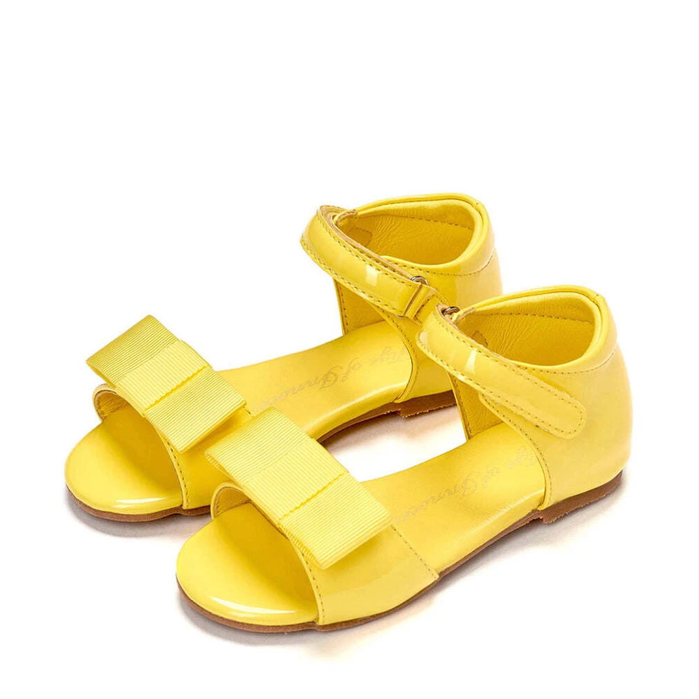 Желтые сандалии Mary — идеальный выбор для первых шагов. При производстве использована комбинация из двух видов кожи: мягкой матовой и глянцевой лакированной. Обувь фиксируется на ноге при помощи ремешка c застежкой велькро и декорирована минималистичным бантом. Рекомендуем носить с легкими сарафанами или джинсовыми шортами.