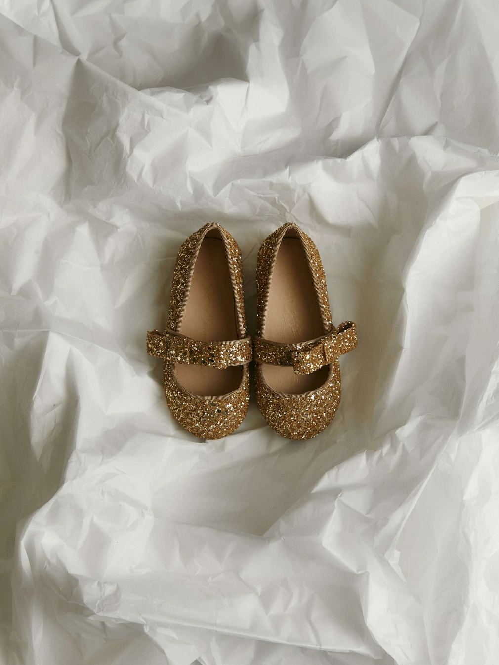 Туфельки Mia выполнены из декоративного золотистого блестящего материала. Подкладка и стелька изготовлены из натуральной кожи. Туфельки, словно созданы из блесток, с кокетливым бантиком на ремешке. Несмотря на очевидную «нарядность» модели, туфельки будут чудесно сочетаться с джинсами и обычной белой футболкой.