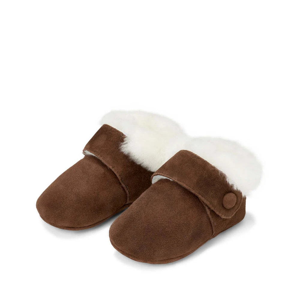 Познакомьтесь с нашей новой моделью — теплыми пинетками MiniMuni. Они изготовлены из мягкой замши и утеплены натуральной овчиной. Пинетки застегиваются на удобный ремешок с застежкой велькро. MiniMuni — идеальная первая зимняя пара обуви для малыша.