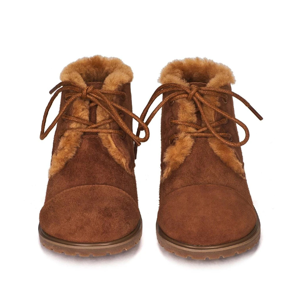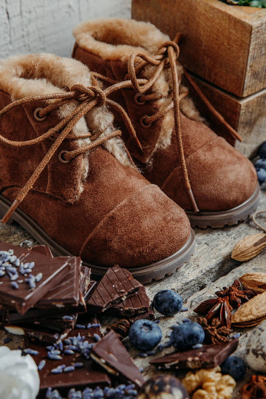 Стильные и удобные коричневые замшевые ботиночки Zoey — наши фавориты. Сделанные из мягкой натуральной замши, со 100% овчиной и с толстой рифленой подошвой ботиночки Zoey идеальны для прогулок. Декорированные изящной шнуровкой в цвет обуви ботиночки чудесно будут смотреться с платьями, юбками и тёплыми колготками.